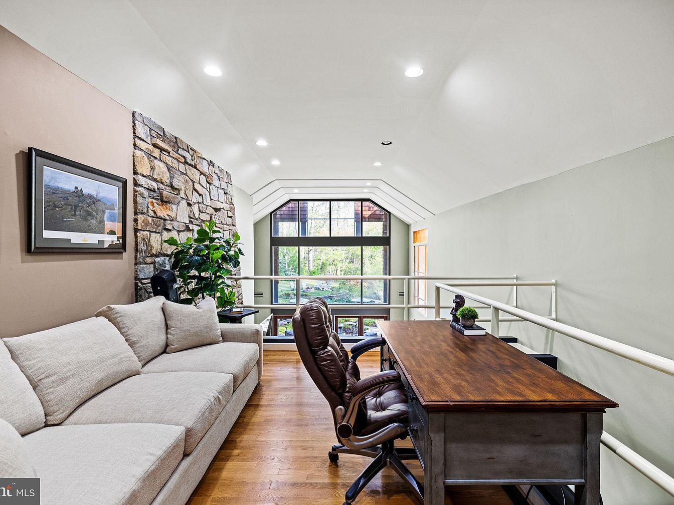 This airy loft area serves as a quiet workspace or reading nook, elegantly perched overlooking the living space below. A striking stone accent wall on one side contrasts the soft beige and light green walls, adding texture and warmth. The large, geometric window floods the space with natural light, framed by stylish molding that enhances the vaulted ceiling. Furnishings include a neutral-toned, plush sofa that invites relaxation and a rich wooden desk paired with a cushioned leather office chair, complementing the hardwood floor. A touch of greenery on the corner adds a lively, fresh element to the serene atmosphere.