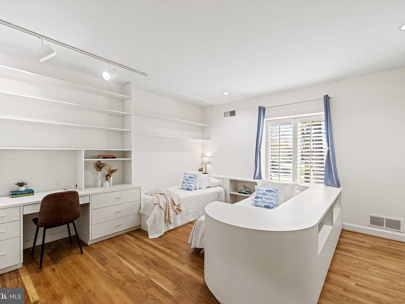 This bright, shared bedroom features two twin beds positioned against the walls, separated by a built-in white desk and shelving unit that maximizes space and functionality. The room’s white walls and furniture create a crisp, clean backdrop, enhanced by light hardwood floors that add warmth. A large window with white plantation shutters and soft blue curtains invites natural light, creating an airy and inviting environment. Blue-and-white patterned pillows and subtle decor add gentle pops of color. The curved desk with shelving seamlessly integrates with the beds, making the space perfect for study and relaxation with modern, minimalist appeal.