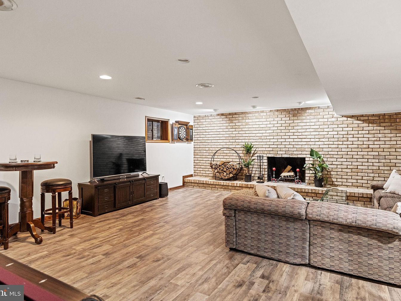 This basement lounge features a cozy yet open layout with a rustic brick fireplace serving as the focal point along one wall. The floor is covered with warm-toned wood-look laminate, complementing the earthy tones of the brick. A large sectional sofa with textured fabric cushions sits adjacent to the fireplace, creating an inviting seating area. Opposite, a dark wood entertainment cabinet supports a flat-screen TV, flanked by a small, round pub-style table with matching stools, ideal for casual gatherings. Recessed ceiling lights provide ample illumination, while small wall windows and indoor plants add subtle natural and organic touches, blending comfort with function.