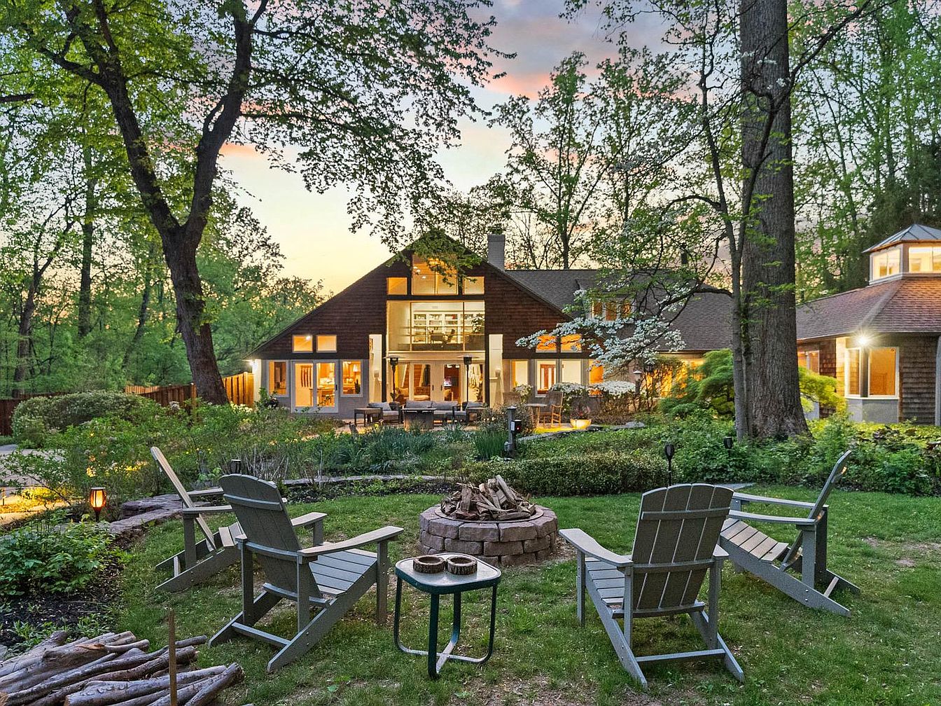 This serene backyard space centers around a rustic stone fire pit, encircled by four wooden Adirondack chairs painted in a soft gray tone, inviting relaxation and social gatherings. A small, simple side table sits nearby on the green lawn, ready for drinks or snacks. The surrounding garden beds feature lush greenery and low shrubs, framed by towering mature trees that provide a natural canopy. In the distance, the house reveals warm interior lighting through large windows, which highlights a combination of natural wood siding and neutral exterior tones, merging modern comfort with tranquil woodland charm.