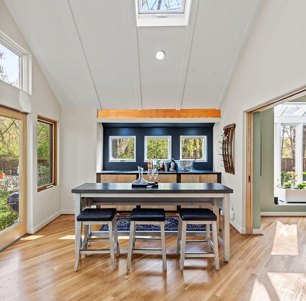 This serene dining space features a vaulted ceiling with a skylight and a recessed light fixture, lending an airy and bright atmosphere. The focal point is a sleek rectangular table with a dark top and white base, paired with three cushioned stools that have black upholstery for comfort. Natural light floods in from the large glass door and adjoining windows, emphasizing the light wood flooring that adds warmth to the room. The back wall is accented in a deep navy blue with three square windows, highlighting a minimalist bar area with a wooden cabinet and various glassware, making the space both functional and inviting.