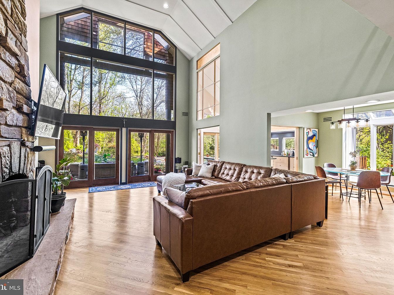 This spacious living area features soaring vaulted ceilings paired with expansive floor-to-ceiling windows, flooding the room with natural light and offering serene views of lush greenery outside. A rich brown leather sectional anchors the seating area, adding warmth and comfort against soft sage green walls. Adjacent to the living space, an open layout reveals a modern dining area with a glass-top table and sleek, brown chairs. The natural hardwood flooring runs seamlessly throughout, while a stone fireplace with a mounted TV creates a cozy focal point. Subtle art pieces and greenery enhance the inviting, contemporary ambiance.
