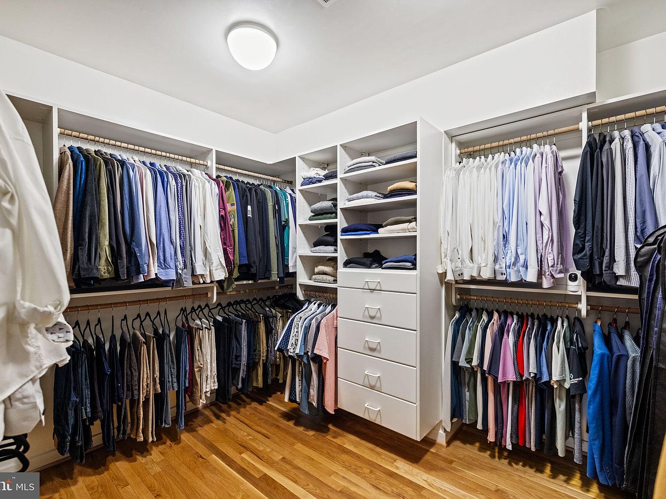 This spacious walk-in closet features a smart and efficient layout with double-tiered wooden hanging rods and built-in shelving units. White cabinetry adds a clean, modern touch, with drawers and open shelves neatly displaying folded clothes. The clothing is organized by type and color, enhancing the room’s orderly feel. Warm wood flooring contrasts beautifully with the white walls and cabinetry, while a recessed ceiling light provides ample illumination. The design balances functionality and aesthetics, making it easy to view and access the wardrobe while maintaining a sleek, polished look.