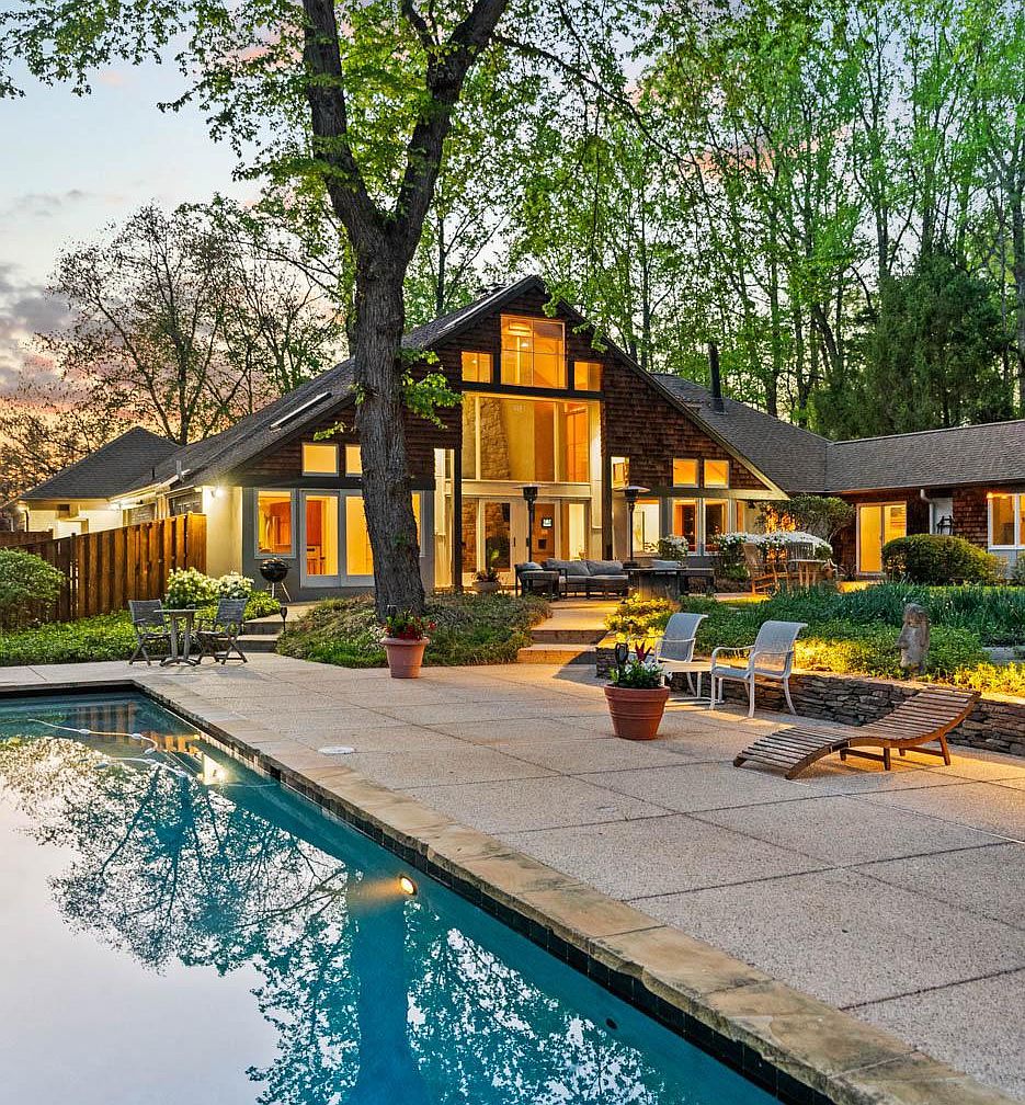 This serene backyard features a spacious pool with clear blue water, bordered by a light stone coping and an expansive textured concrete deck. Comfortable outdoor seating, including modern lounge chairs and a curved wooden lounger, invite relaxation. The patio area extends to an inviting exterior with large glass doors and towering windows illuminating the home’s interior in warm, golden light. Natural wood siding complements the earthy colors of lush greenery and mature trees, creating a balanced blend of rustic and contemporary aesthetics. Several potted plants and subtle landscape lighting enhance the tranquil ambiance as dusk settles.