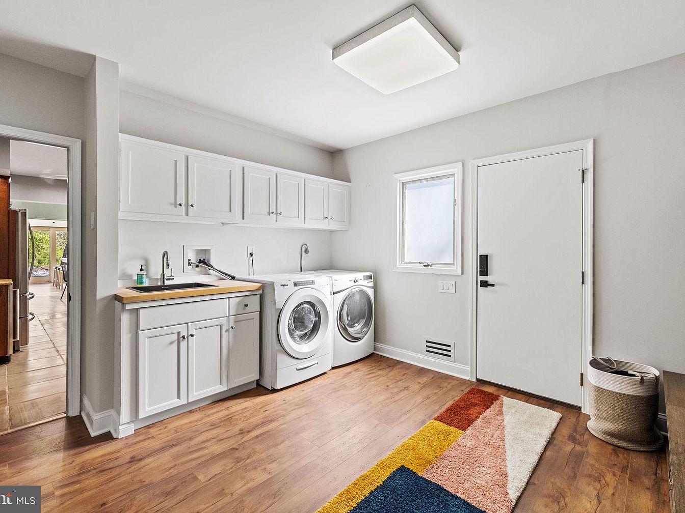 This well-lit laundry room combines functionality with a clean, modern design. Along one wall, white cabinetry offers ample storage both above and below a wooden countertop, which houses a sleek stainless steel sink and faucet. Adjacent are front-loading washer and dryer units in white, aligning neatly beneath the cabinetry. Neutral walls enhance the bright ambiance, complemented by a single frosted window that allows natural light while preserving privacy. The warm wood flooring contrasts subtly with the white elements, adding warmth to the space. A vibrant, multicolored rug adds a playful touch, while a textured woven basket sits near the door for convenience and organization.