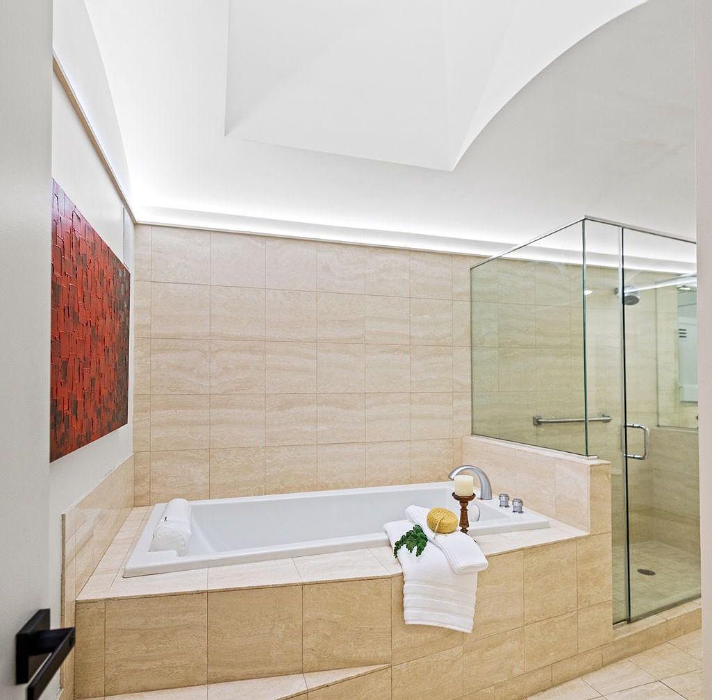 This bathroom area features a recessed rectangular bathtub surrounded by beige tiles that extend seamlessly onto the walls and floor, creating a cohesive and warm look. Adjacent to the tub is a glass-enclosed walk-in shower with minimalist silver hardware that adds to the clean, modern aesthetic. Above the tub, indirect lighting highlights the white ceiling’s unique angular architecture, enhancing the sense of spaciousness. A bold red textured artwork on one wall introduces a vibrant contrast. Accessories like a folded white towel, a candle on a wooden stand, and a natural sponge add subtle touches of comfort and elegance.
