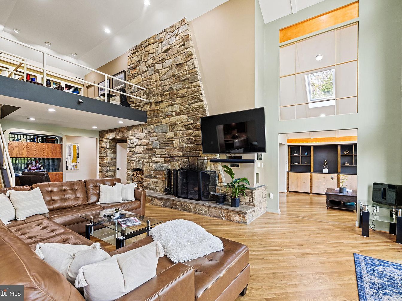 This spacious living room features a warm, inviting design anchored by a large stone fireplace with an integrated wood storage nook. The sectional leather sofa in rich tan tones is complemented by soft, white throw pillows and a plush throw, arranged around a sleek glass coffee table. Natural wood floors add a cozy touch, extending throughout the open layout. An upper loft with white railings overlooks the space, enhancing the room’s airy, multi-level feel. The wall-mounted flat-screen TV is positioned for easy viewing, while greenery adds a subtle natural accent to this modern yet rustic room.