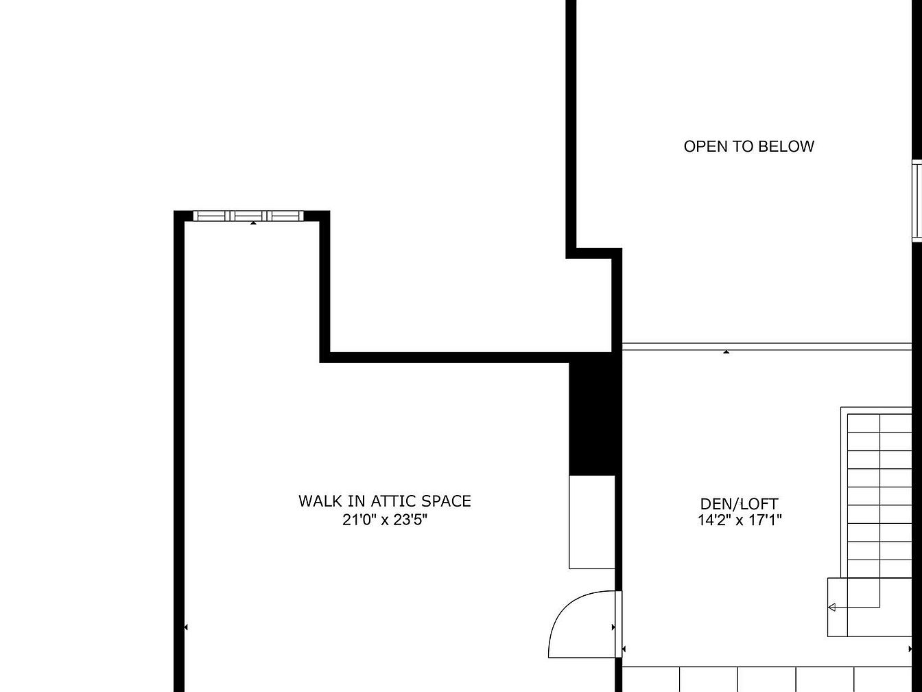 This area is a spacious walk-in attic measuring 21’0″ by 23’5″, providing a large, open space suitable for storage or potential conversion. The layout is straightforward with a single door entrance connecting to a den/loft area sized 14’2″ by 17’1″. Noticeably, a portion of the floor plan is marked “Open to Below,” suggesting an overlook or balcony from the den/loft area, adding architectural interest and allowing light to flow between levels. The strong black border lines clearly define each section, optimized for functionality and flexible use.