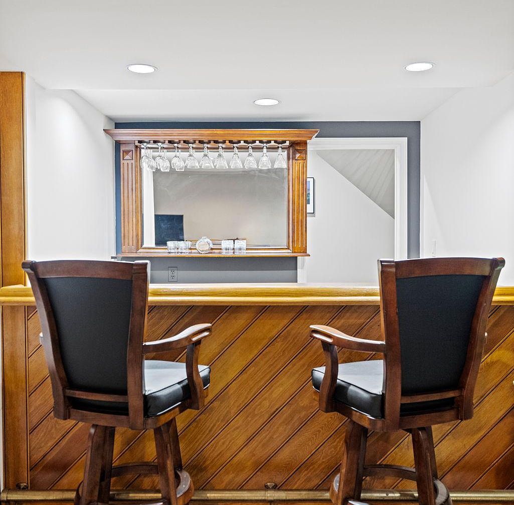 This cozy bar area features warm wood tones with a classic paneled front bar counter running horizontally across the space. Two high-backed bar stools with dark wooden frames and black upholstery provide seating. Above the bar, a wooden-framed mirror adds depth, enhanced by a rack overhead displaying inverted wine glasses, ready for use. The wall behind is painted in a muted gray, bordered with crisp white trim, creating a clean contrast against the rich natural wood. The space is brightly lit with recessed ceiling lights, emphasizing the inviting atmosphere within this intimate entertaining nook.