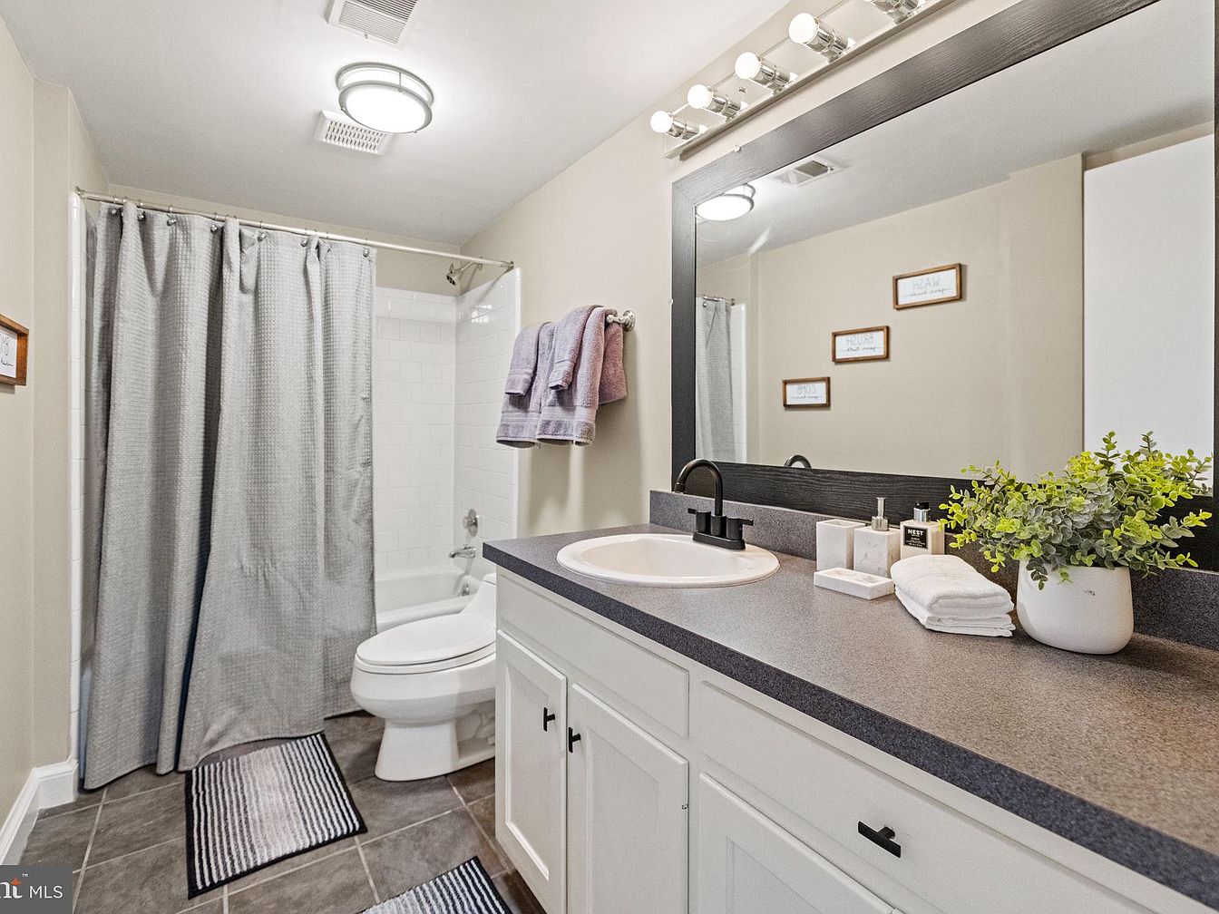 This bathroom features a clean and functional design with a neutral color palette of soft beige walls, white cabinetry, and dark gray countertops. The vanity has a single, white oval sink with a matte black faucet, providing a subtle contrast. Above the sink is a large rectangular mirror framed in black, complemented by a modern light fixture with multiple bulbs for ample lighting. Adjacent to the vanity, a white bathtub with a tiled surround is enclosed by a textured gray shower curtain. The space is accented by striped floor mats and lavender hand towels, creating a cozy, inviting atmosphere. A potted green plant adds a touch of freshness to the countertop decor.