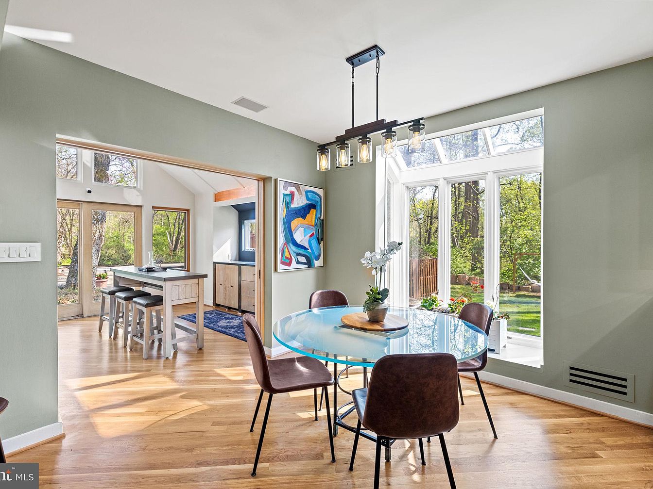 This dining space features a round glass-top table surrounded by four brown leather chairs with slender black metal legs, creating a sleek yet inviting seating area. Walls are painted in a muted sage green, complementing the warm honey-toned hardwood floors that extend throughout the open layout. Large floor-to-ceiling windows flood the room with natural light and offer serene garden views, enhancing an indoor-outdoor connection. A modern linear chandelier with exposed filament bulbs adds industrial charm overhead. Adjacent to this area, an open doorway leads to a kitchen nook with a high island and stools, maintaining a cohesive flow in the living space.