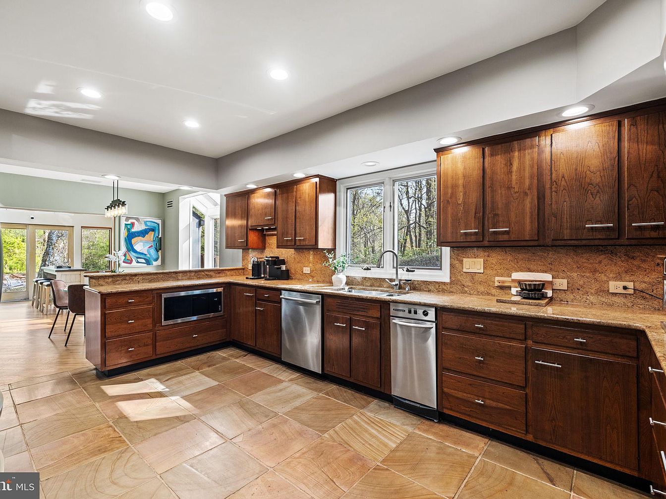This spacious kitchen features a U-shaped layout with rich, dark wood cabinets that create a warm and inviting atmosphere. The granite countertops and matching backsplash add a natural, earthy texture that complements the large square tile flooring in soft beige tones. Under-cabinet lighting and recessed ceiling lights brighten the space, while stainless steel appliances, including a dishwasher and built-in microwave, offer modern convenience. A large window above the sink floods the kitchen with natural light and provides a pleasing outdoor view. The open connection to the adjacent dining area enhances flow and openness.