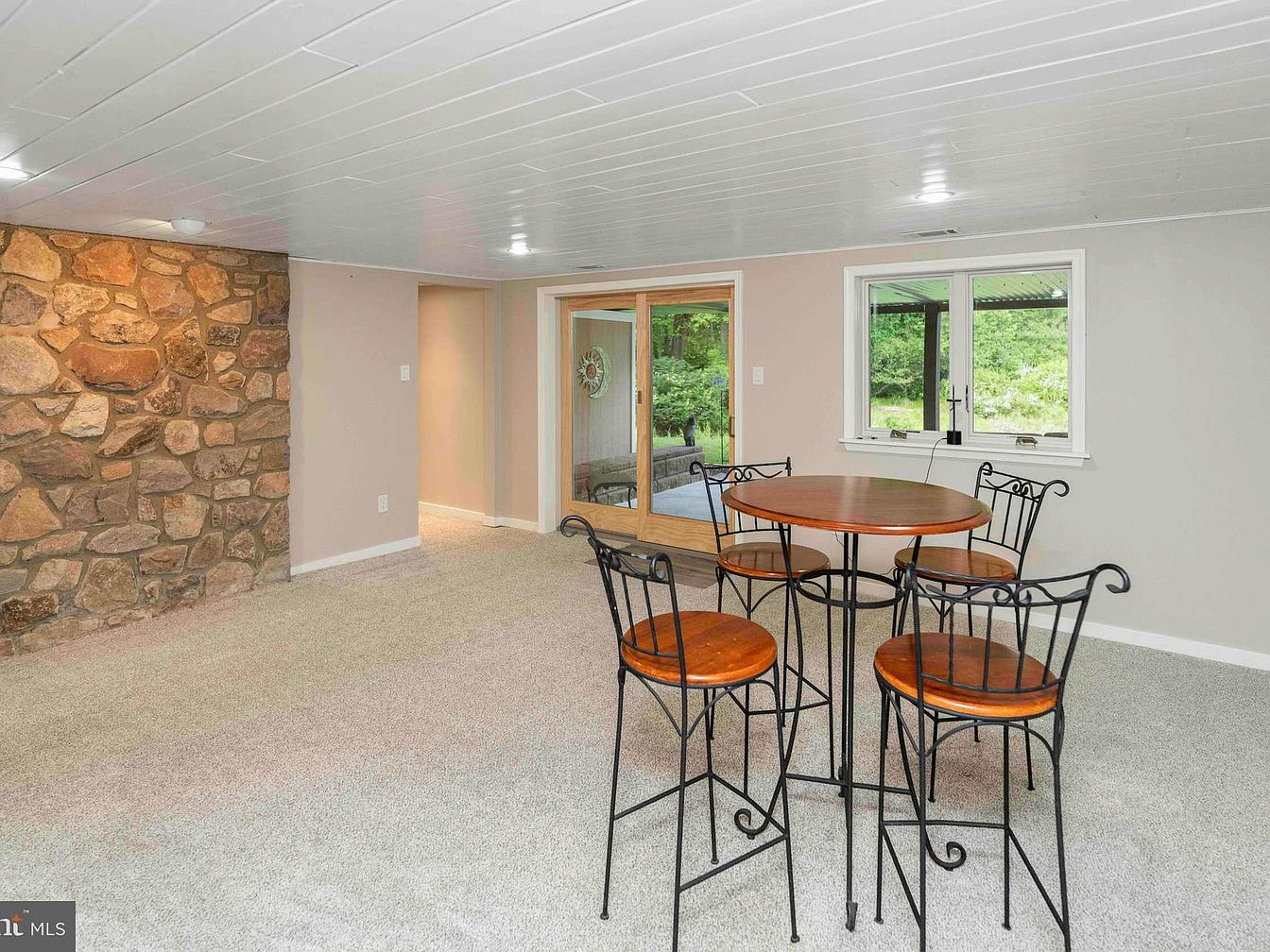 This inviting basement space features a neutral color palette with soft beige walls and plush light gray carpeting, creating a warm and comfortable atmosphere. A distinctive stone accent wall adds rustic charm and texture, contrasting beautifully with the smooth painted surfaces. The ceiling is finished with white paneling and recessed lighting, enhancing the brightness and openness of the room. A black wrought iron table and four matching chairs with wooden seats provide a casual dining or game area near a window and glass sliding doors, which offer views and access to the outdoors.