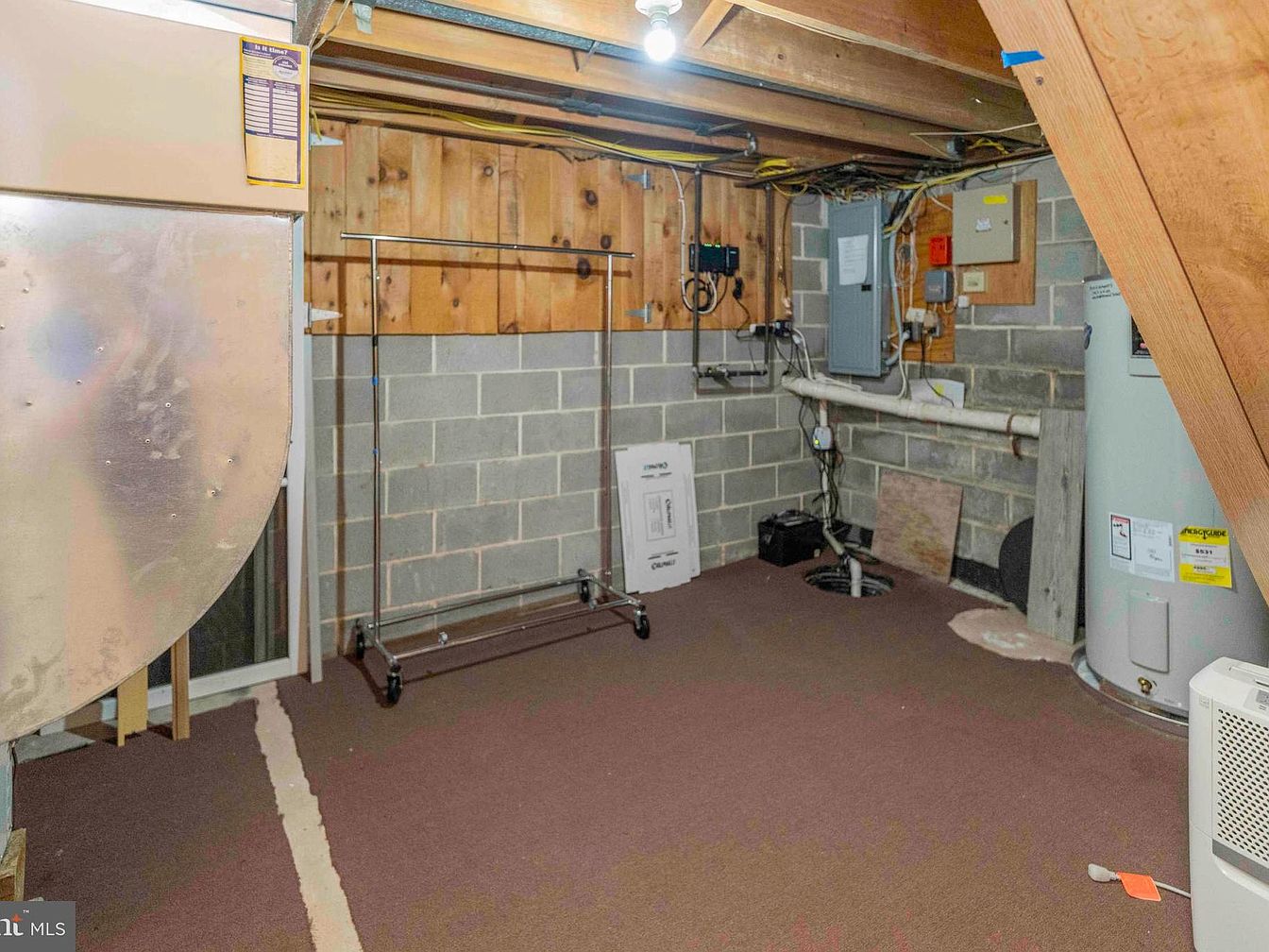 This basement corner is primarily functional, featuring exposed cinder block walls and unfinished ceiling beams with visible wiring. Light wood paneling crowns part of the wall, contrasting with the cool gray blocks. A utility panel and water heater are installed along the far walls, indicating the space’s role in housing essential home systems. The floor is covered with a brown carpet that adds some warmth and softness underfoot. A metal rolling garment rack suggests limited storage or workspace usage. Overall, the area exudes a raw, practical vibe focused on utility rather than decor.