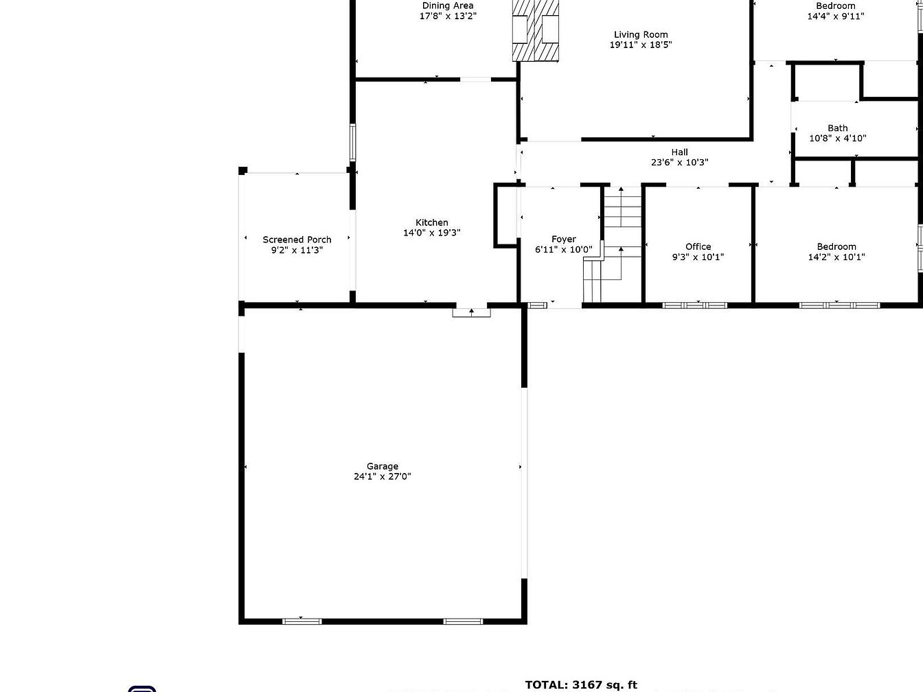 This detailed floor plan reveals a spacious single-level layout spanning 3,167 square feet. The focal point is the large garage occupying the lower-left corner, measuring 24’1″ by 27′. Adjacent to the garage is a screened porch and a sizable kitchen (14’0″ x 19’3″), which connects seamlessly to a dining area and a living room that measures 19’11” by 18’5″. The floor plan also includes a central hall connecting various rooms, launching from a compact foyer near the entry stairs. Two bedrooms, an office, and a bath complete the right side. Clean lines and functional separation of living and utility spaces dominate the architectural approach.