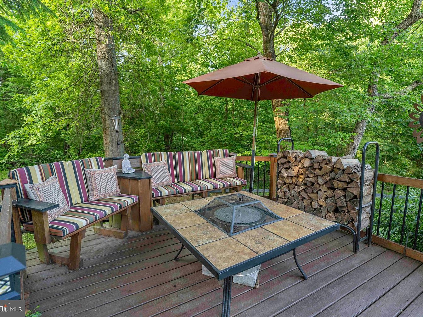 This cozy outdoor deck space features a wraparound wooden bench with striped cushions in earthy tones of green, maroon, beige, and brown, accented by patterned throw pillows for added comfort. A central square fire pit table with tiled surfaces and a black metal frame anchors the seating arrangement, inviting warmth and social gatherings. A large brown umbrella provides shade overhead, while a neatly stacked pile of firewood is conveniently stored on the deck’s side, supported by a metal rack. The setting is surrounded by lush green trees, creating a peaceful, nature-immersed ambiance perfect for relaxation or entertaining outdoors.