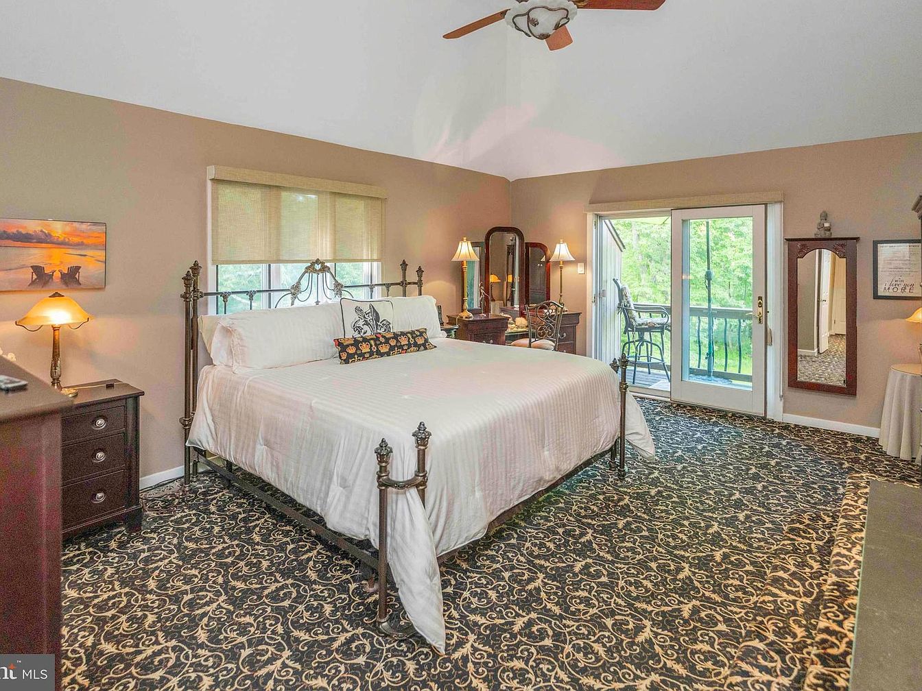 This master bedroom features a high vaulted ceiling with a central ceiling fan, enhancing the spacious feel. The walls are painted in a warm beige tone, complementing the intricate patterned carpet in dark shades with cream-colored swirls that add texture and elegance. A large metal-framed bed with white linens sits centrally, adorned with decorative pillows in black and orange tones. On either side are dark wood furniture pieces, including a nightstand, a dresser, and a vanity with an ornate mirror. Soft lighting from table lamps creates a cozy ambiance. French doors with blinds open to a balcony with outdoor seating, inviting natural light and greenery into the room.