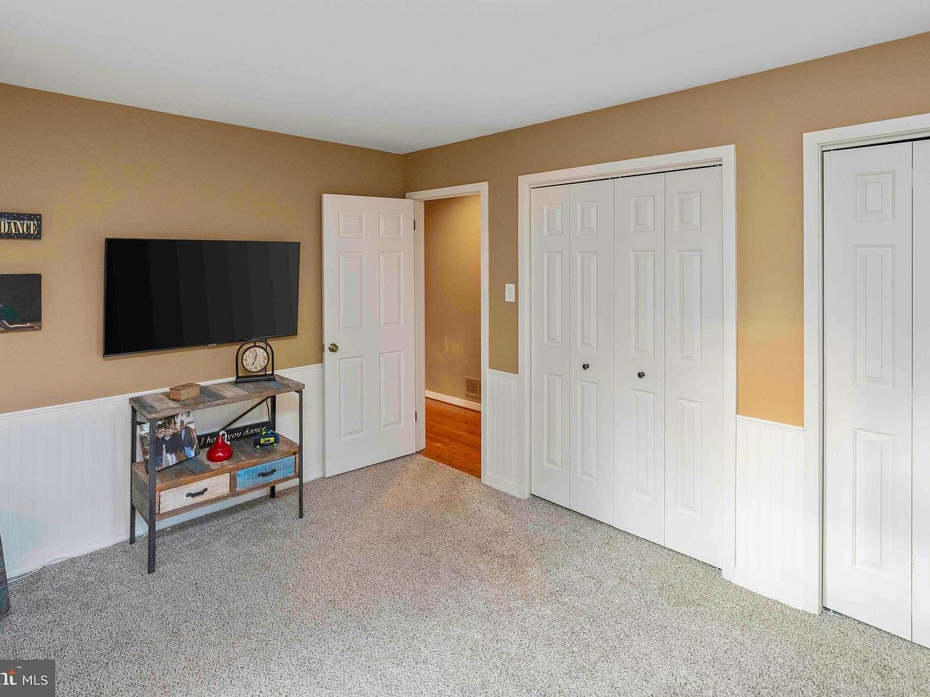 This area features a beige and white color scheme with beige walls and white wainscoting that adds texture and contrast. The room is carpeted in a neutral light gray, complementing the warm tones of the walls. Two sets of white bi-fold closet doors offer ample storage space along the far wall. A small, rustic-style console table beneath a wall-mounted flat-screen TV displays personal items, including photos and a decorative clock. The white door partially open leads into a hallway with warm wood flooring, blending contemporary and cozy design elements effectively in this bedroom corner.