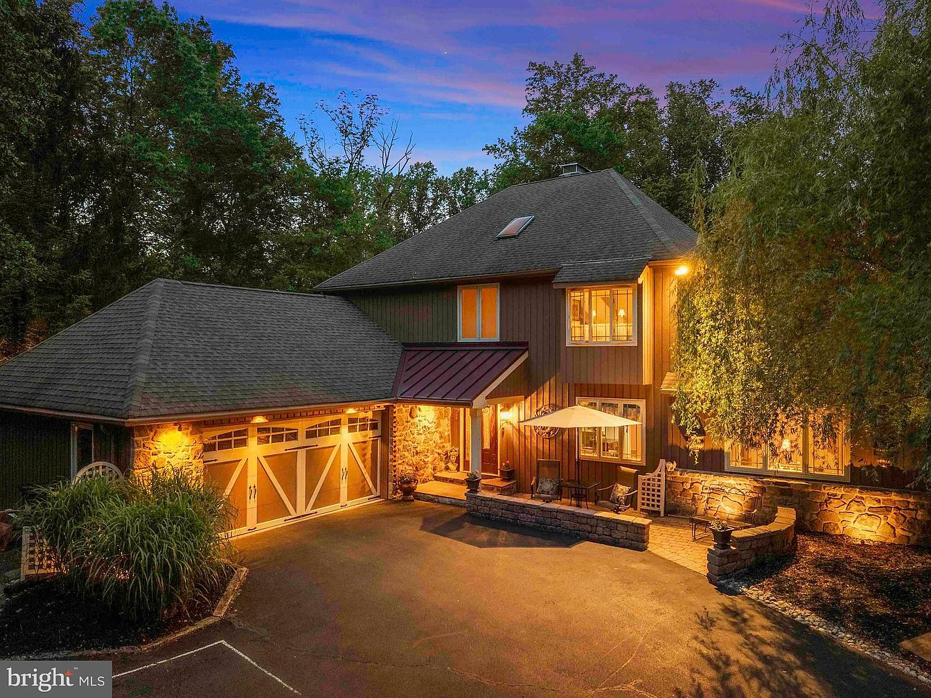 This inviting front exterior features a charming blend of natural stone and vertical wood siding, enveloped in warm, ambient lighting that accentuates the home’s architectural details at dusk. The roof is steeply pitched with a skylight adding a unique touch. A two-car garage with barn-style doors opens to a smoothly paved driveway. Adjacent to the entrance is a cozy stone-walled patio area with comfortable seating and a large umbrella, perfect for relaxing or casual entertaining. Mature trees and well-maintained greenery frame the space, creating a serene and private atmosphere, complementing the rustic-modern aesthetic.