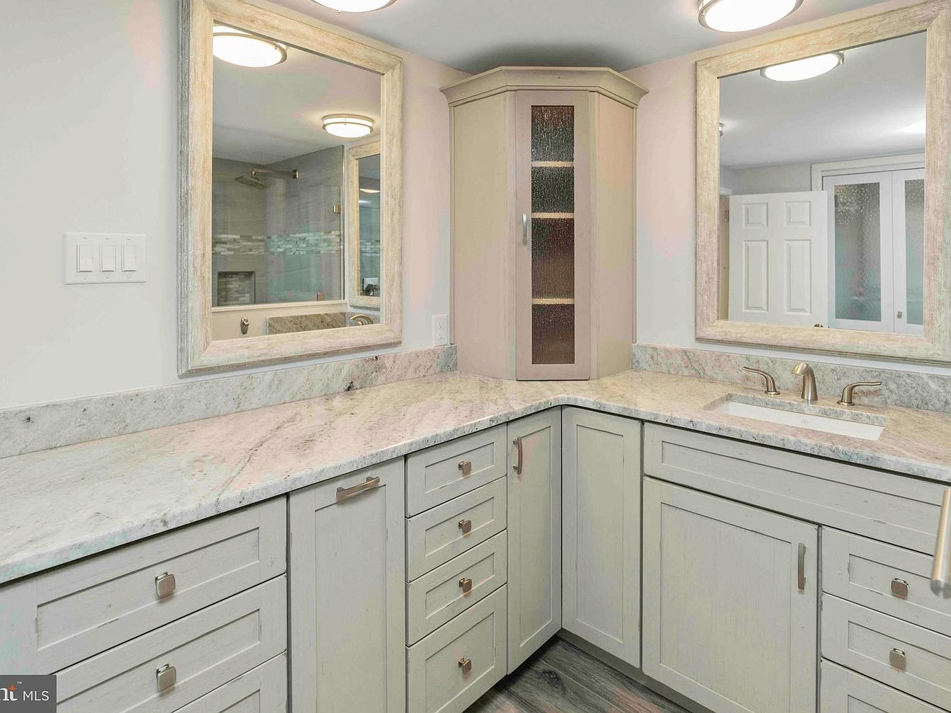 This bathroom vanity corner creates a practical and elegant space with its L-shaped marble countertop featuring subtle gray veining. The cabinetry is painted in a soft muted beige, blending seamlessly with the light neutral walls for a calming, cohesive palette. A unique corner cupboard with textured glass doors maximizes storage while adding visual interest. Matching rectangular framed mirrors hang above each sink area, reflecting the sleek, modern brushed nickel faucet fixtures. The room benefits from bright yet soft overhead lighting, enhancing the clean lines and understated sophistication of the contemporary design.