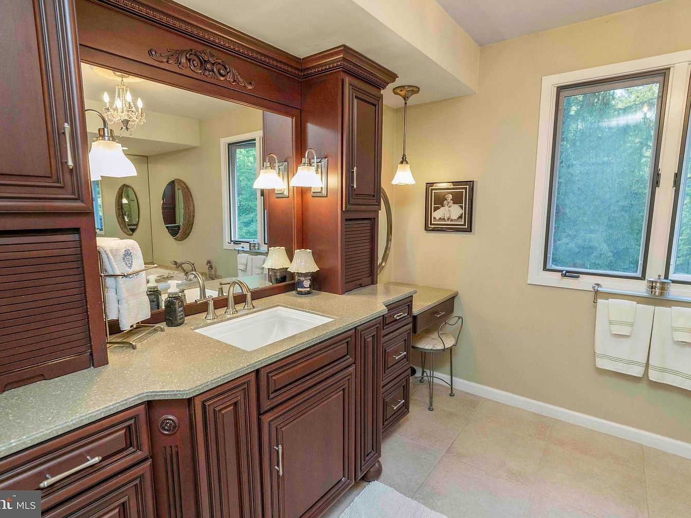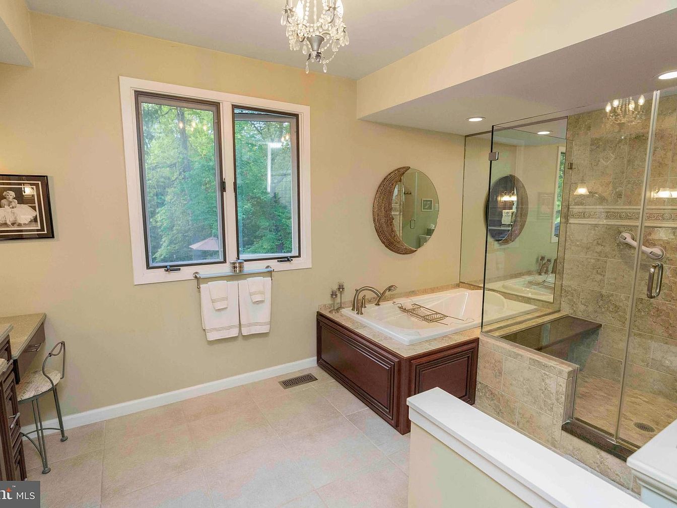 This spacious master bathroom balances modern elegance and comfort with warm beige walls and light tile flooring that create a calm, inviting atmosphere. A built-in bathtub with dark wood paneling accents the space alongside a large glass-enclosed shower featuring intricate beige tile work and a built-in bench. Ample natural light floods in through a double window framed in white trim, enhancing the airy feel. The vanity area includes a small seating nook with a metallic chair, and a delicate chandelier overhead adds a touch of refined sophistication to the serene and functional layout.