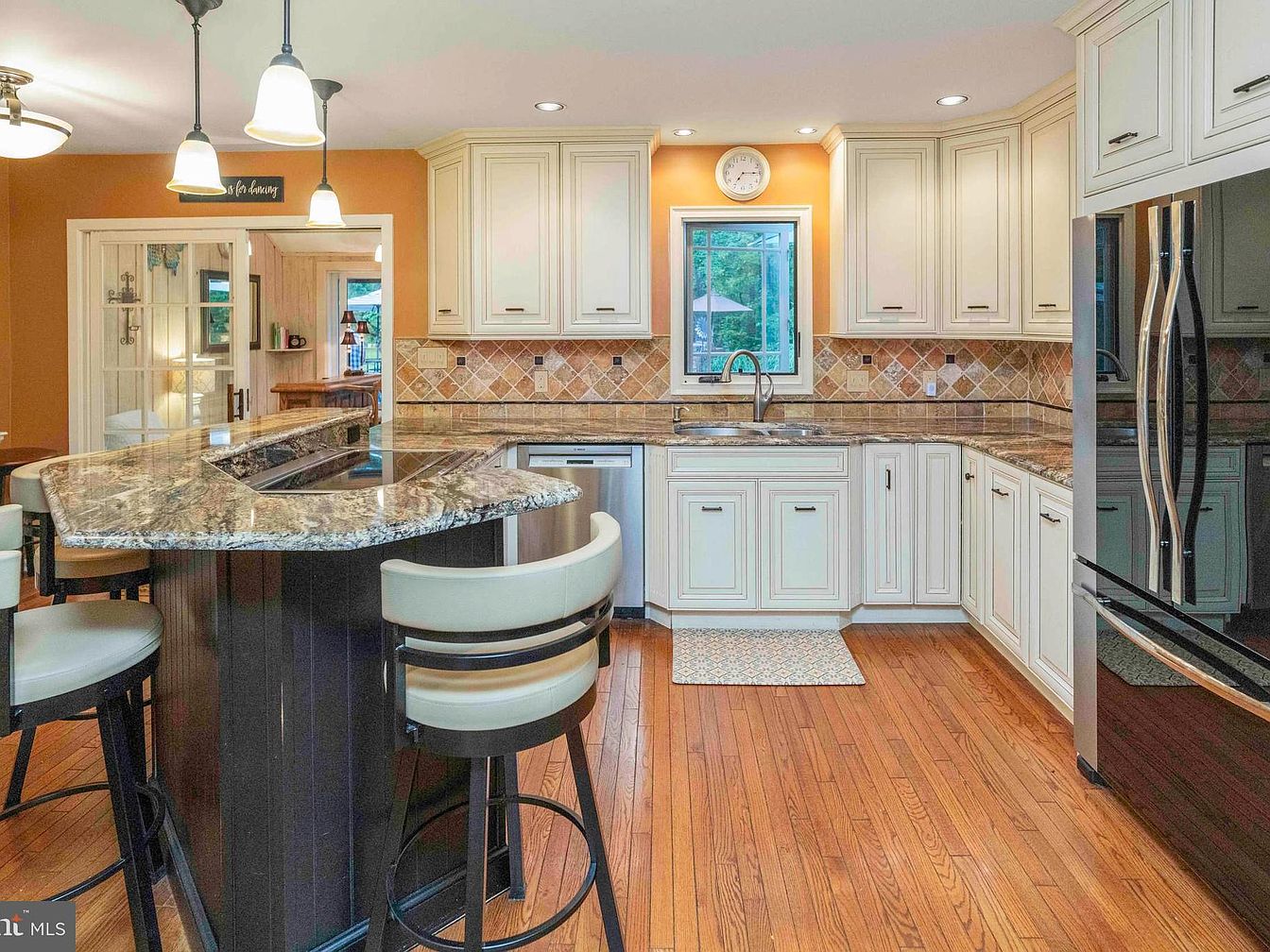 This kitchen features a spacious U-shaped layout with elegant cream-colored cabinetry accented by subtle distressing and dark hardware. Granite countertops with natural stone patterns complement the warm earth tones of the diamond-patterned tile backsplash. A large kitchen island with a raised bar area provides seating with cushioned modern bar stools, creating a cozy breakfast or gathering space. Warm wooden flooring adds richness and contrasts beautifully with the light cabinetry. The orange-painted walls bring warmth and vibrance, enhanced by pendant lighting over the island and recessed ceiling lights creating a welcoming atmosphere. A central window above the stainless steel sink invites natural light into the space.