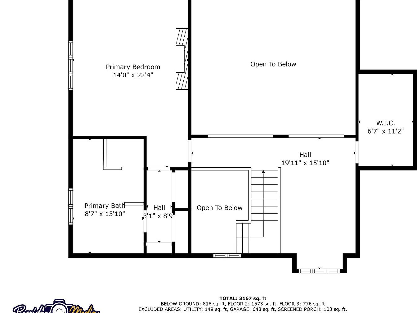 This upper floor plan highlights a spacious primary bedroom measuring 14 by 22 feet, complete with a fireplace for cozy ambiance. Adjacent to the bedroom is a generously sized primary bath and a walk-in closet tailored for ample storage. The design includes two open-to-below areas, inviting abundant natural light and a sense of openness from the floor below. A large hall space connects these rooms, with stairs leading down to the lower floor. The layout emphasizes both privacy and flow, combining functional living with luxurious proportions and strategic openness.