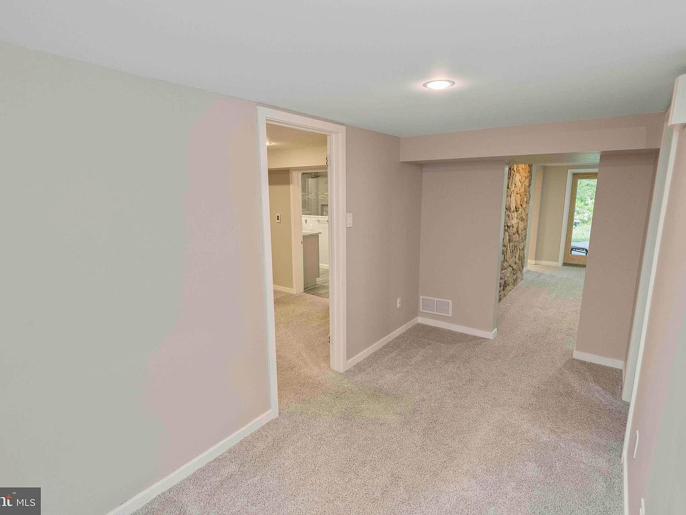 This basement hallway features soft beige walls that create a warm, neutral atmosphere, complemented by plush light-gray carpeting that adds comfort underfoot. The space is softly illuminated by recessed ceiling lighting, offering a clean and modern feel. The hallway leads to multiple rooms, with a doorframe on the left revealing a glimpse of a bathroom or utility space. A textured stone accent wall adds natural character and visual interest along one side, while a glass door at the far end invites natural light, offering a subtle connection to the outdoors.