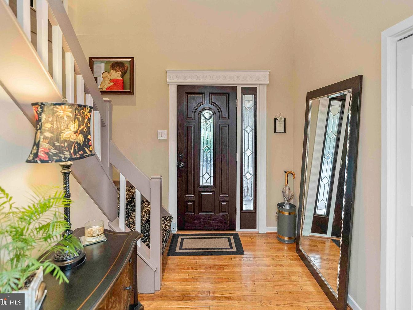 The entryway features a rich, dark wooden front door with decorative stained glass panels on either side, adding elegance and natural light. The hardwood flooring in warm tones complements the neutral cream walls, creating a welcoming ambiance. To the right, a large, tilted floor mirror with a black frame enhances the perception of space and reflects light. The small umbrella stand beside the mirror adds practicality. On the left, a staircase with a muted gray railing ascends beside a dresser topped with a detailed floral lampshade and green plant, infusing charm and personality into the space.