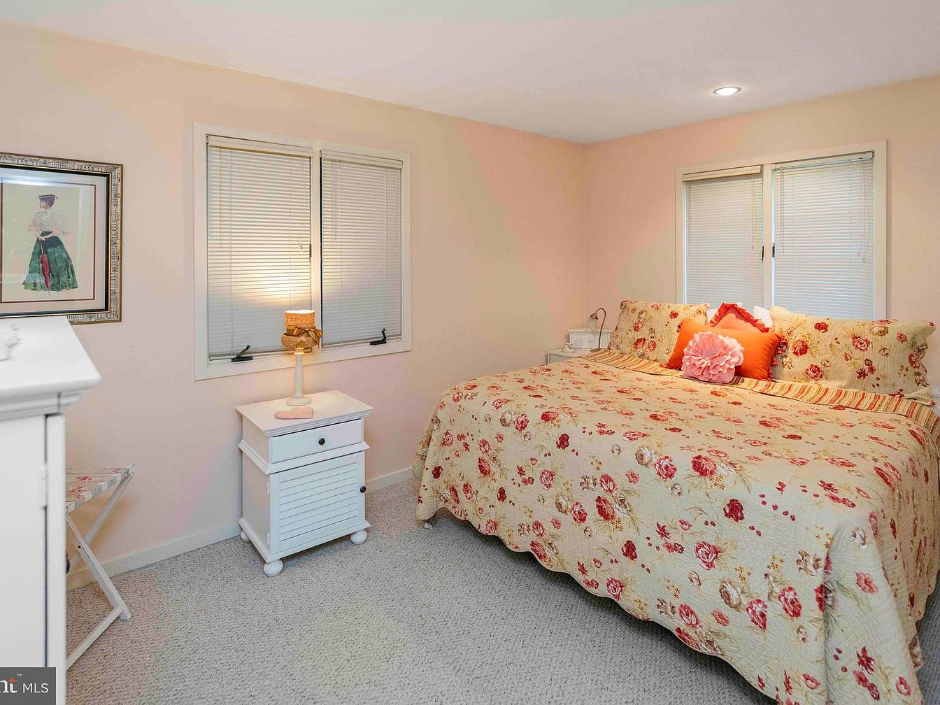 This intimate bedroom features a warm, neutral palette with soft beige walls and light carpeting that enhances the cozy atmosphere. The bed is adorned with a floral quilt in shades of red and beige, complemented by vibrant coral and pink accent pillows adding a cheerful touch. Two windows with white blinds provide balanced natural light with privacy control. White wooden furniture, including a pair of nightstands and a dresser, offers practical storage while maintaining a light and airy feel. Architectural simplicity and pastel tones create a tranquil and inviting retreat.