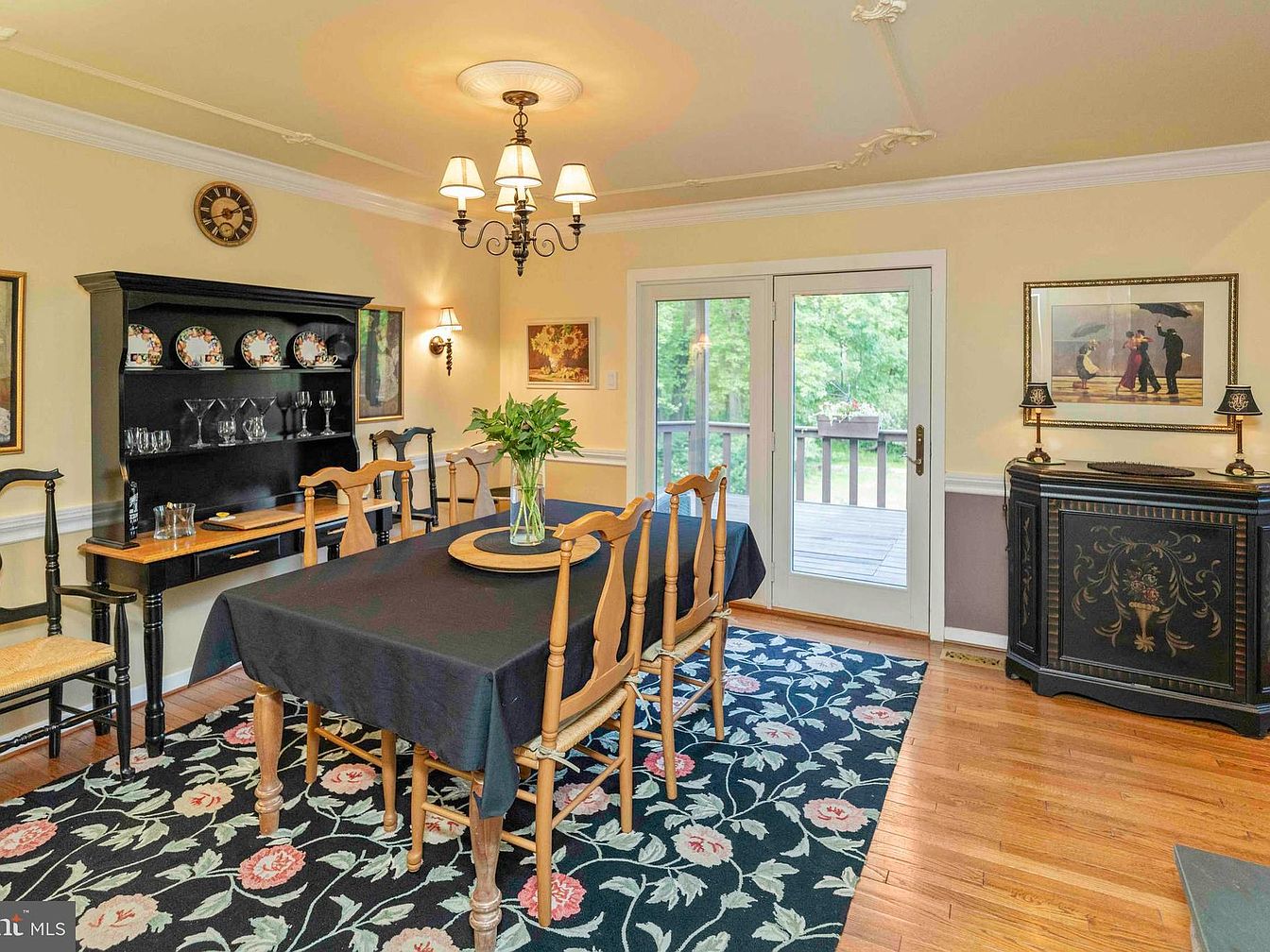 This elegant dining room showcases a warm and inviting atmosphere with soft beige walls contrasted by rich wood tones. The central wooden dining table, covered with a dark tablecloth, is surrounded by classic spindle-back chairs with woven seats. A floral-patterned area rug in navy blue anchors the space, adding color and texture. Complementing the setting, a black display cabinet holds delicate glassware and decorative plates, while a painted corner cabinet adds charming artistic flair. Soft lighting from a chandelier and wall sconces highlights intricate ceiling molding. French doors open to a lush outdoor view, extending natural light throughout the room.