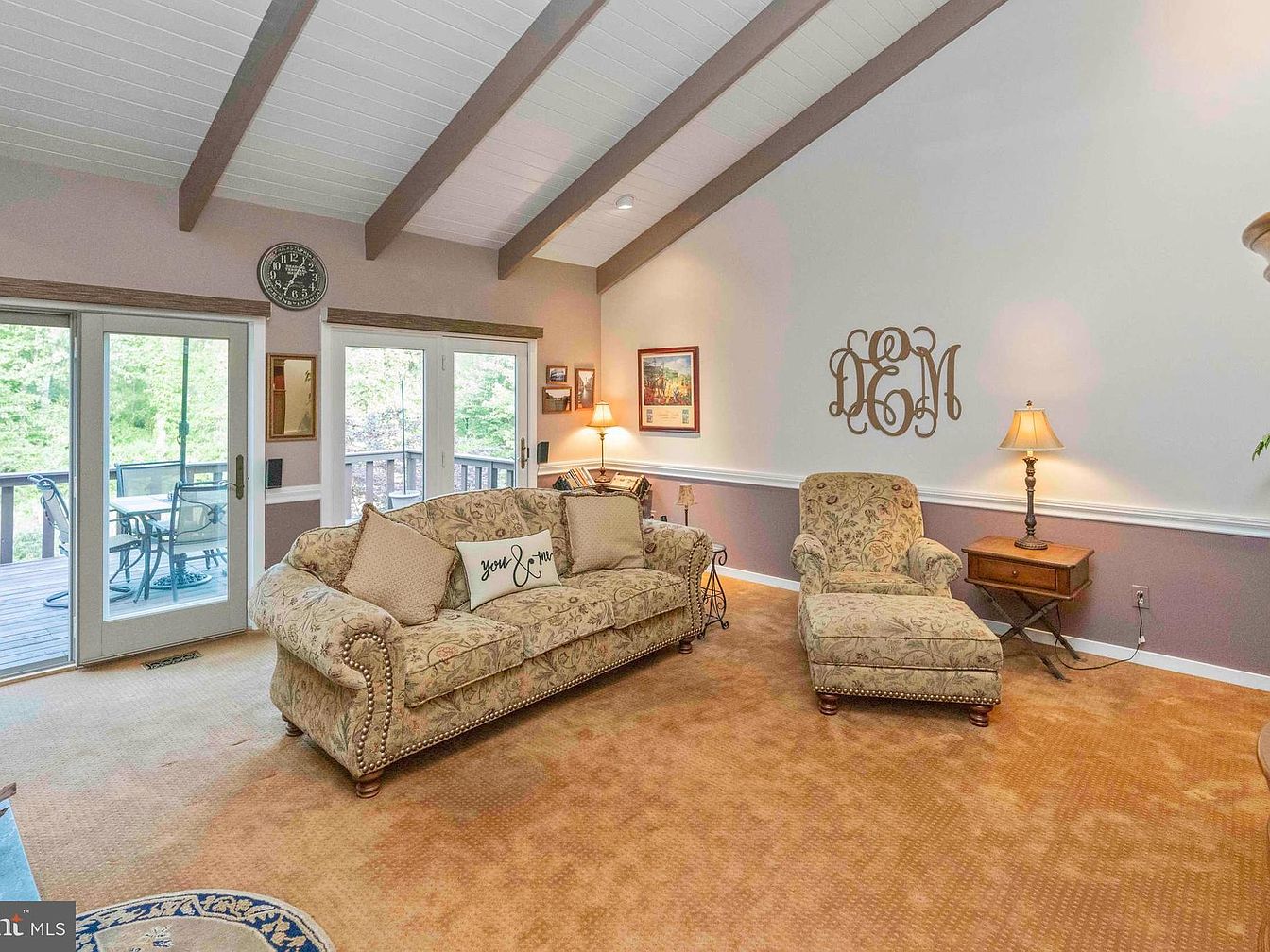 This inviting sitting room features a vaulted ceiling with exposed wooden beams painted in muted gray tones, complementing the white ceiling planks. The walls are adorned with a two-tone palette—soft mauve below the chair rail and crisp white above—creating a warm and calming atmosphere. Plush, patterned sofa and matching armchair with ottoman add classic charm and comfort. The seating area is anchored by a caramel-colored carpet, contrasting subtly with the lighter walls. Natural light filters in through double glass doors leading to a deck with outdoor seating. Accent lighting includes table lamps that provide a cozy, ambient glow. Decorative accents like the monogram wall art and framed prints personalize the space tastefully.