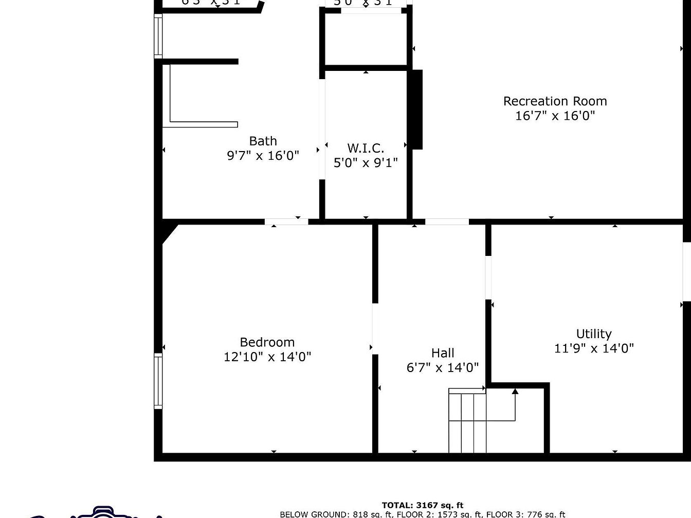 This basement layout includes a spacious recreation room measuring approximately 16’7″ by 16′, ideal for family gatherings or entertainment. Adjacent to it is a large bedroom, about 12’10” by 14′, which offers privacy and comfort. A 9’7″ by 16′ bathroom is conveniently located nearby, along with a walk-in closet sized at 5′ by 9’1″, providing ample storage. The utility room, measuring roughly 11’9″ by 14′, ensures functional space for household systems. The hall connects these rooms and includes stairs leading to the upper floors, highlighting a practical and well-organized basement design.