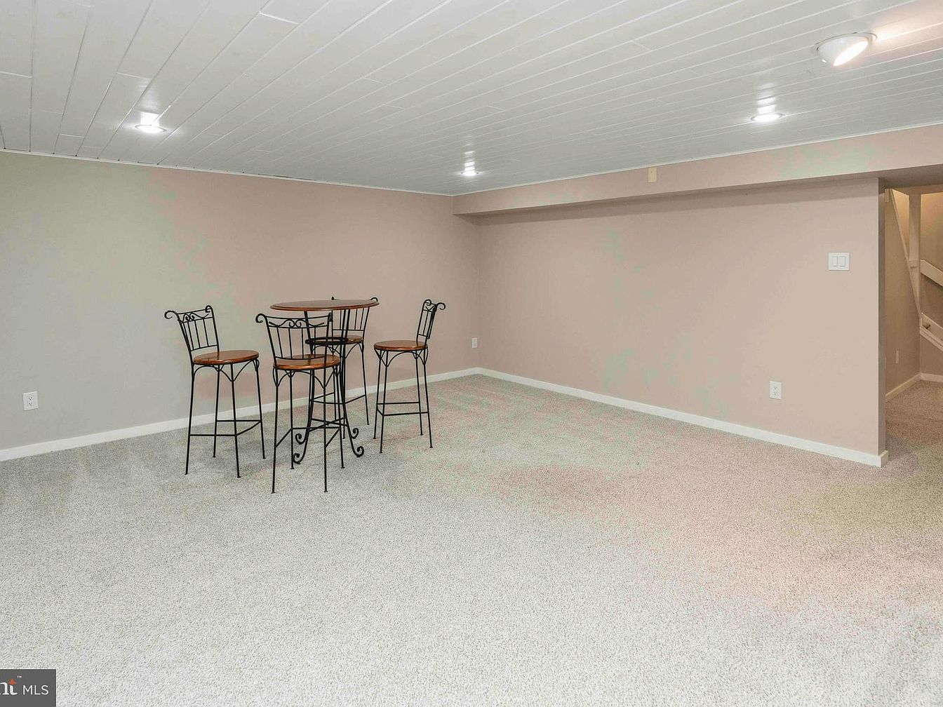 This basement lounge features a spacious, open layout with neutral-toned walls combining beige and light gray, complemented by plush light gray carpeting underfoot. The white paneled ceiling with recessed lighting creates a bright, inviting atmosphere despite being below ground level. Furnished simply with a wrought iron and wood high-top table set, the space exudes a casual, cozy vibe, ideal for a relaxed gathering or game night. A small doorway leads to adjacent rooms or stair access, emphasizing functionality alongside comfort. The overall minimalist design provides a versatile canvas for personalized decor or entertainment needs.