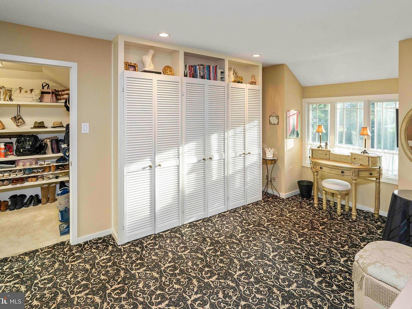 This dressing area offers a cozy layout with a focus on functionality and charm. The floor is covered in a rich black carpet adorned with intricate gold vine patterns, adding a luxurious feel. Beige walls complement the warm tones and create a soft backdrop. White louvered closet doors provide ample storage and add texture to the space, while the top shelves showcase decorative items and books. A vintage-style vanity table with a matching cushioned stool is placed near a window, allowing natural light to brighten this intimate corner. Subtle recessed lighting enhances the space without overpowering its calm ambiance.
