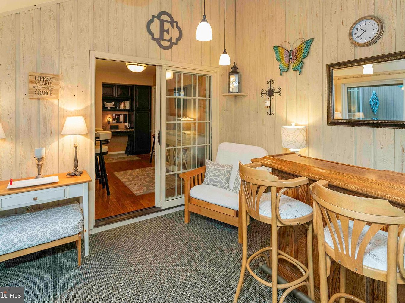 This intimate sunroom features light wood-paneled walls creating a warm, rustic ambiance. The space includes a small wooden bar with two cushioned stools, perfect for casual dining or gathering, alongside a cushioned wood-framed loveseat with patterned throw pillows enhancing comfort. Soft overhead pendants provide cozy lighting, complemented by a table lamp to the left sitting on a slim white console table with patterned bench seating below. Decor elements like a vibrant butterfly wall hanging, a decorative cross, and a large rectangular mirror add color and visual interest. A sliding glass door connects this room to an adjoining interior space with hardwood floors.