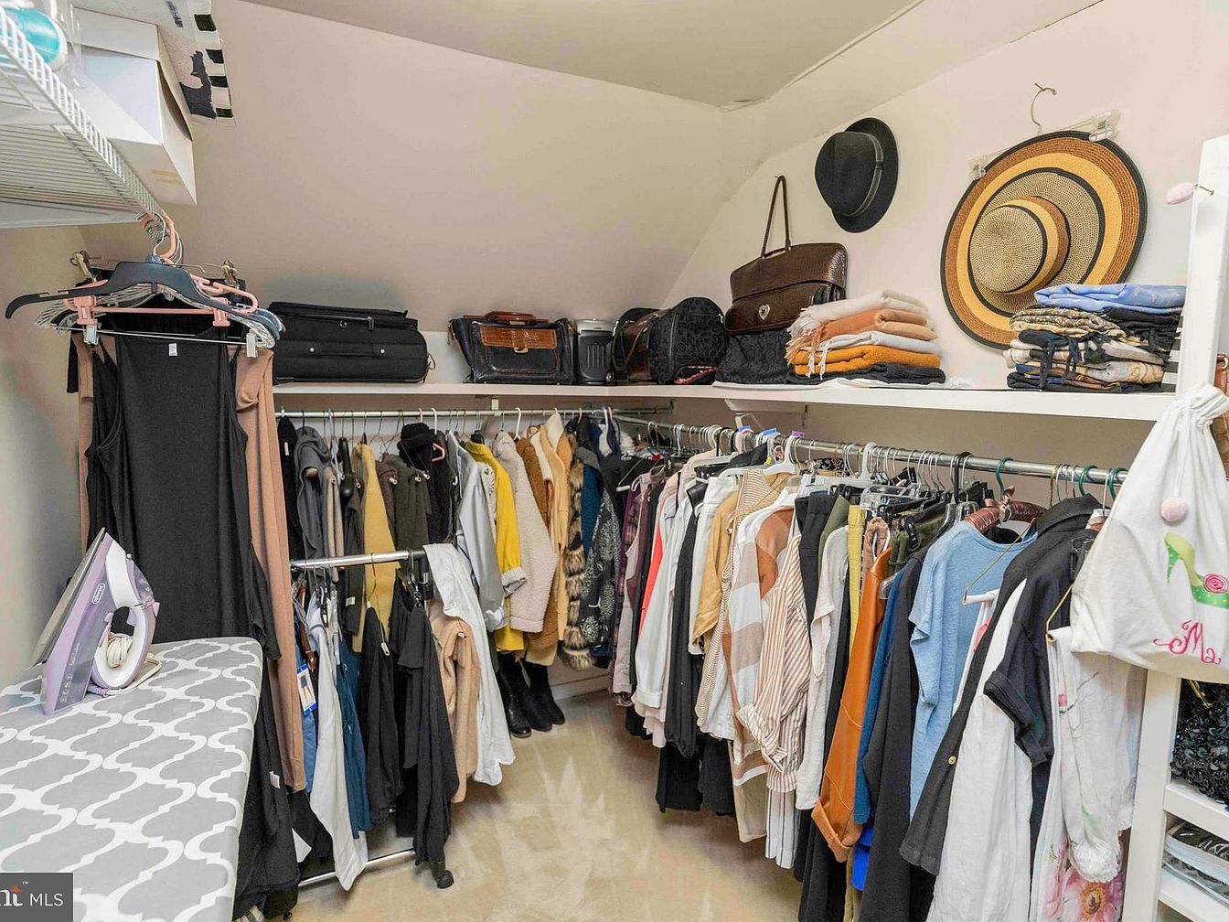 This well-organized walk-in closet maximizes its sloped ceiling space with a dual-tiered clothing rod system, allowing for ample hanging garments arranged by type and color. Above the rods, a continuous white shelf spans the room’s perimeter, holding neatly stacked clothes, handbags, and accessories. The light neutral palette of the walls and beige carpeting creates a soft backdrop, highlighting various textiles and textures within the clothing collection. An ironing board with a patterned cover sits on one side, adding functionality. Hats and bags hang on the upper wall, adding visual interest and practicality to this efficiently designed dressing space.