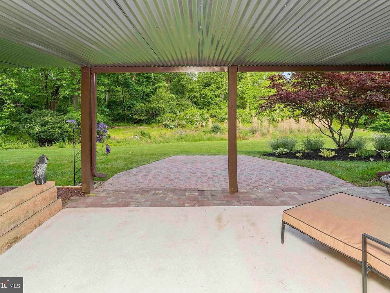 This covered patio area opens gracefully to a spacious backyard, blending indoor comfort with outdoor tranquility. A durable metal roof shelters the concrete seating zone, providing shade and protection from the elements. Supporting wooden beams frame the view towards a patterned stone paver extension, ideal for additional seating or a small gathering. The patio is edged by a low brick retaining wall, adding structural definition. Vibrant landscaping surrounds the scene, featuring a lush green lawn, ornamental grasses, a small Japanese maple tree, and flowering plants, creating a peaceful and inviting garden ambiance.