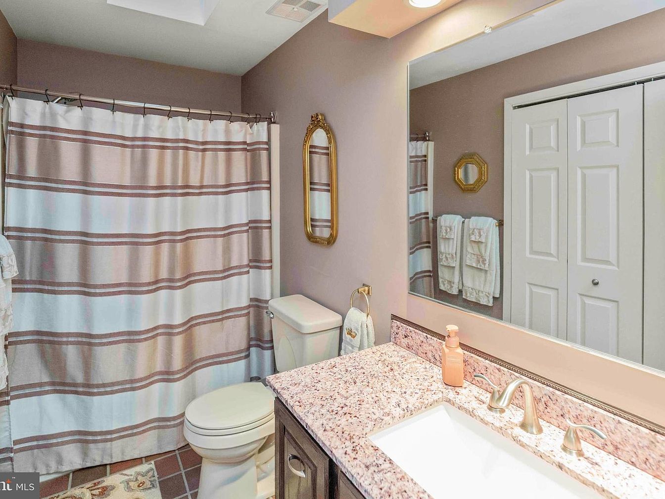 This bathroom features a warm, muted mauve wall color providing a gentle backdrop to the space. The vanity showcases a speckled pink granite countertop with an undermount white sink, paired with brushed nickel fixtures for a modern touch. An expansive mirror above the vanity enhances light distribution and the sense of openness. To the left, a striped shower curtain in neutral tones of beige and white adds subtle pattern. The white toilet is positioned between the vanity and bathtub. Accents such as a gold-framed oval mirror and coordinating towel ring reflect an elegant, cohesive style. The floor is tiled in a reddish-brown pattern, grounding the overall design.