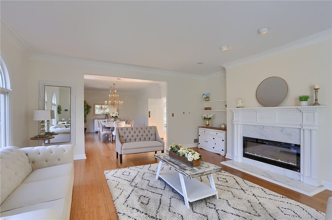 This spacious living room features warm honey-toned hardwood floors that tie together a soothing neutral palette of soft creams and whites. A large, textured area rug with geometric patterns anchors the seating area, which includes a tufted cream sofa and matching loveseat with clean lines. The fireplace is a standout architectural detail, framed in classic white marble with an elegant mantel adorned with minimalistic decor including a round mirror and small plants. Built-in shelves and a white sideboard provide subtle storage and decor space. Natural light streams in through a tall arched window, enhancing the airy and inviting ambiance. Through a wide open doorway, a chandelier-lit dining room is visible, providing a graceful flow between spaces.