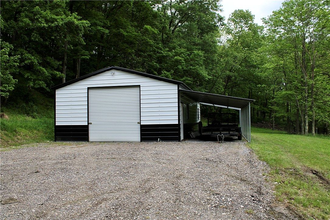 This detached garage features a classic utilitarian design with a white metal siding accented by black trim along the lower portion, providing a clean, modern appearance. The large roll-up door in the center allows easy access for vehicles or storage. Attached on the right side is a covered carport area, open on three sides, ideal for parking additional vehicles or equipment, with a gravel driveway extending in front of the structure. Surrounded by lush green trees and grass, this garage blends practicality with a serene rural setting, perfect for outdoor enthusiasts or those needing extra storage space.