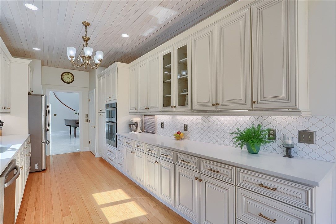 This spacious kitchen features an elegant, long white countertop complemented by classic cream-colored cabinets with intricate molding details and brass hardware. The backsplash showcases a subtle, patterned white tile that adds texture without overwhelming the serene palette. Above, a soft wood-paneled ceiling in muted gray tones contrasts gently with the brightness below, and a vintage-style brass chandelier adds warmth and character. Light wood flooring enhances the inviting atmosphere, while stainless steel appliances blend seamlessly into the space. The layout is functional, with ample storage and natural light streaming in, creating a clean, polished, and welcoming culinary space.