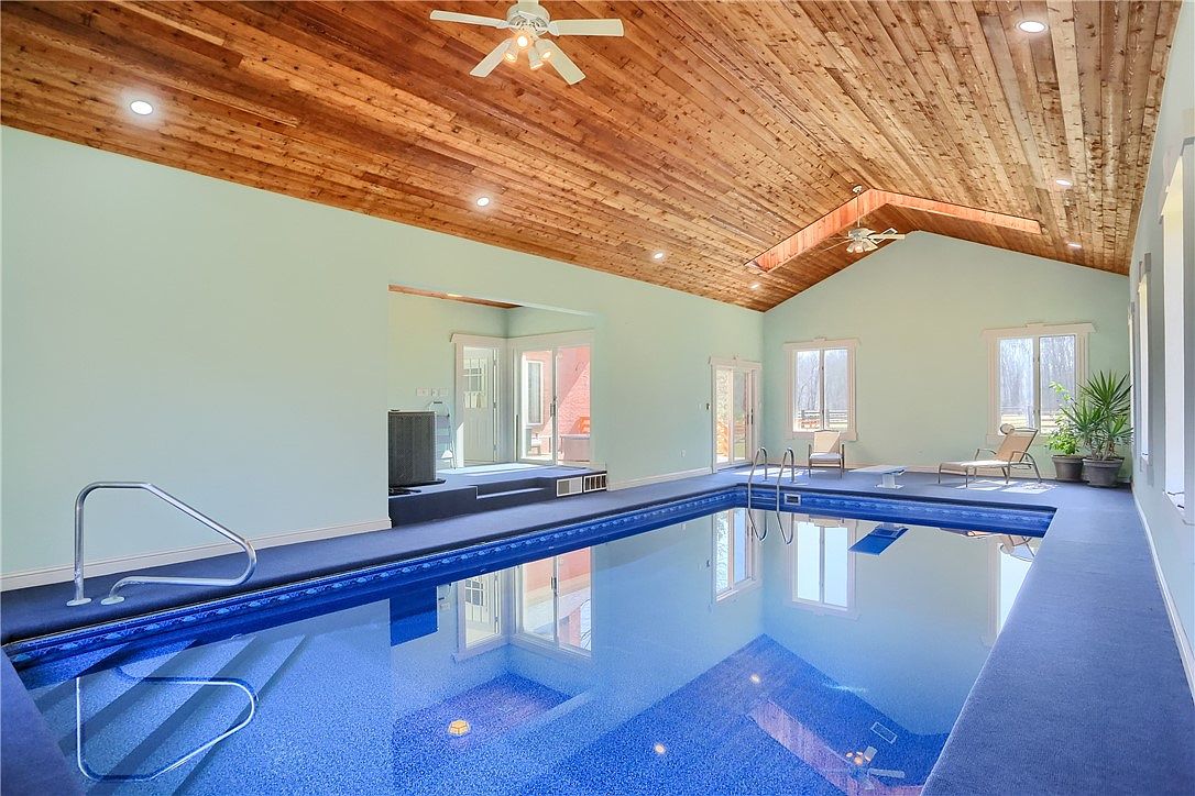This spacious indoor pool room features a calming pale blue wall color that complements the deep blue pool water, creating a serene and inviting atmosphere. The vaulted ceiling is clad in warm wood planks, adding natural texture and a touch of rustic elegance. Recessed lighting combined with ceiling fans ensures ample illumination and air circulation. Large windows and a glass door bring in natural light, while the pool’s metal handrails and tiled steps enhance safety and accessibility. Minimalist lounge chairs and a few potted plants provide comfortable relaxation spots and a subtle touch of greenery.