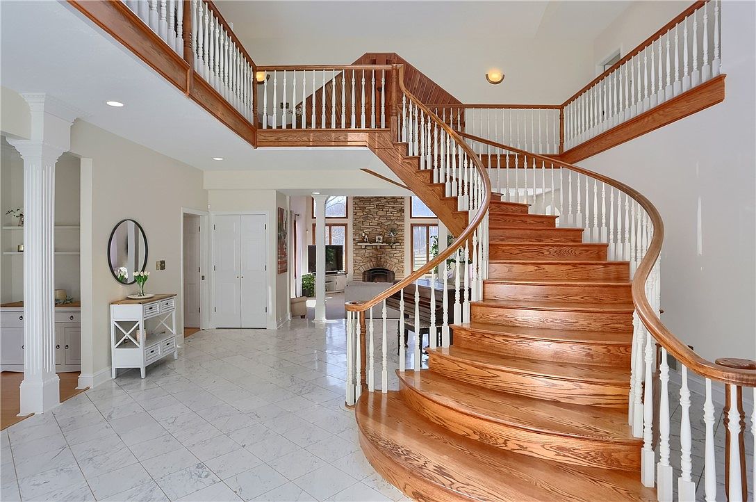 This spacious entryway features a striking, curved wooden staircase with white spindles and a warm oak handrail that gracefully sweeps upward to the second floor. The high ceiling enhances the airy feel, complemented by recessed lighting and soft, neutral wall tones. Below, the polished marble floor offers a subtle contrast with delicate veining, adding elegance and durability. Architectural columns define an adjacent space, framed by an archway that leads to additional rooms. Natural light filters in from the back through large windows, illuminating a cozy sitting area with a stone fireplace, blending classic charm with modern openness.
