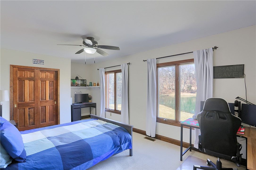 This comfortable bedroom features a practical layout combining sleeping and work areas. The bed takes center stage with a modern metal frame and a blue checkered comforter that contrasts softly against the light cream walls. Rich wooden trim around the windows and doors adds warmth, complemented by matching wooden double closet doors. Two large windows with white curtains allow natural light to pour in, offering peaceful views of a pond and surrounding trees. Opposite the bed, a small black desk holds a computer setup under a minimalist white shelf. A ceiling fan with light hangs overhead, blending functionality with simplicity for a cozy, inviting atmosphere.