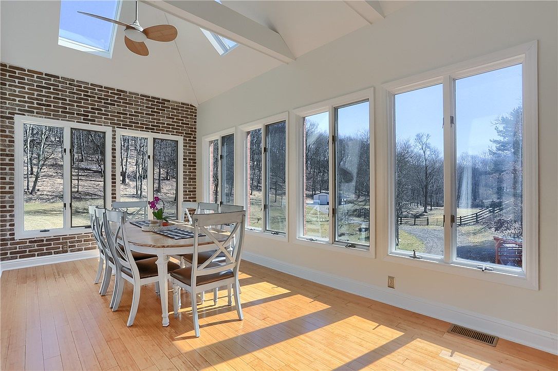 This sunroom dining area features expansive floor-to-ceiling windows wrapping around two walls, allowing abundant natural light to flood the space and provide sweeping views of the wooded landscape outside. The vaulted ceiling is enhanced by skylights and a modern ceiling fan with wooden blades, adding both ventilation and style. A striking exposed brick accent wall introduces texture and warmth, contrasting softly with the clean white walls surrounding it. The flooring is a warm-toned hardwood, complementing the light gray dining table and matching cross-back chairs, which seat six comfortably for meals or gatherings in this serene, nature-inspired setting.