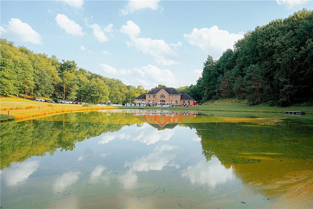 A scenic outdoor setting features a tranquil lake reflecting a large, stately brick home with multiple windows and a gabled roofline. The house is centered amidst a lush green landscape framed by mature trees on both sides, creating a private, serene atmosphere. The sky above is bright with scattered fluffy clouds, adding to the peaceful ambiance. Cars are parked along a grassy area to the left, suggesting an event or gathering at the property. The water’s surface acts as a mirror, enhancing the overall picturesque quality and inviting a relaxed connection with nature.