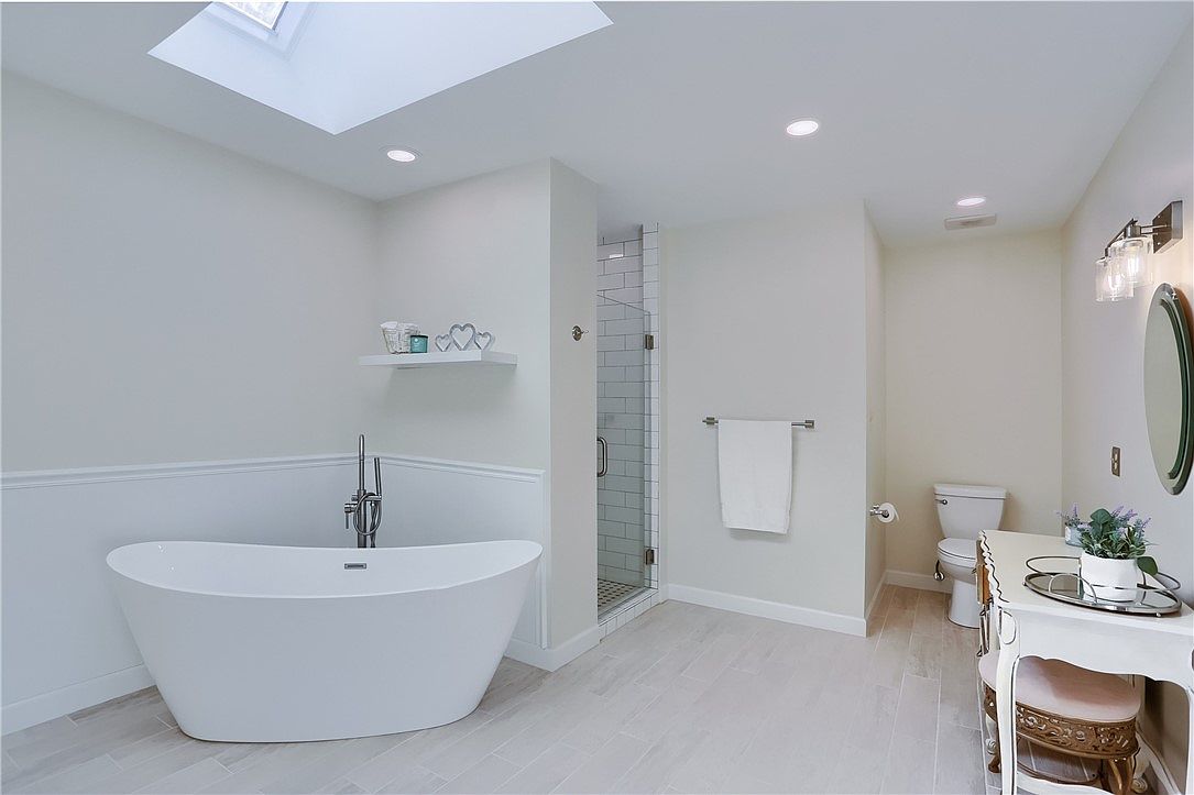 This bathroom features a serene and spacious layout with a modern freestanding white bathtub positioned against a light, neutral wall. The room is illuminated by recessed lighting and a skylight above, bringing natural light into the space. Adjacent to the tub is a glass-enclosed shower with white subway tile walls, complementing the clean aesthetic. The floor is covered in light wood-effect tile, extending warmth while maintaining the airy atmosphere. A small vanity with an oval mirror and a cushioned stool adds a touch of vintage charm, while white walls and minimal decor keep the look fresh and inviting.