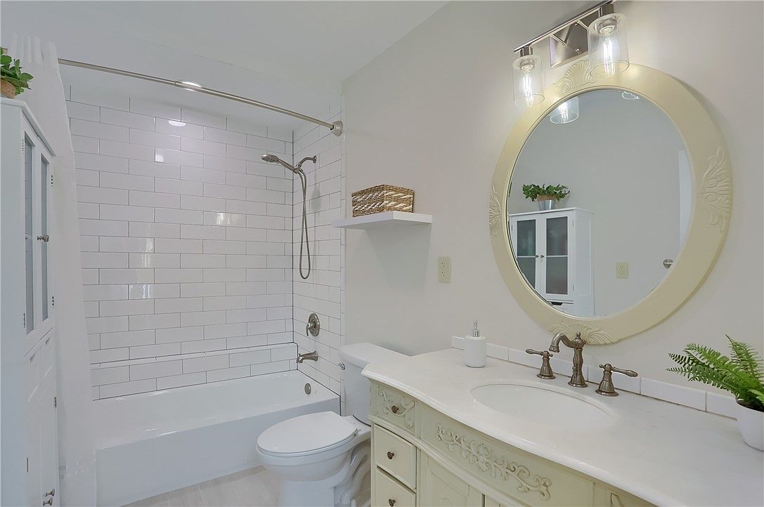 This bathroom combines classic and modern design elements for a clean and inviting space. The white subway tile surrounding the bathtub adds a timeless touch, while the curved shower rod allows for a spacious curtain setup. The vanity features ornate detailing with a pale cream finish, topped with a smooth white countertop and an integrated sink. Above it hangs a large round mirror with subtle embossed patterns on its frame. The faucets and light fixtures have a vintage bronze tone, complementing the overall aesthetic. Small decorative plants and a wicker basket add warm, natural accents.
