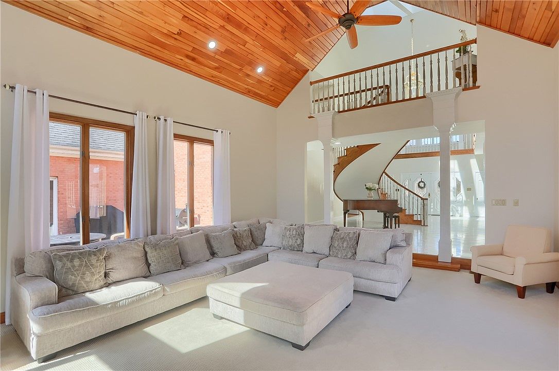 This spacious living room features a vaulted wood-paneled ceiling with recessed lighting and a ceiling fan, introducing both warmth and grandeur. Large windows with white curtains line one wall, allowing natural light to flood the space, enhancing the neutral-toned, plush large sectional sofa and ottoman at the room’s center. The off-white walls complement the light carpet, establishing a bright, airy atmosphere. Visible beyond, a curved wooden staircase with wrought iron balusters adds architectural charm while a grand piano accents the foyer, creating an inviting transition between the living area and the home’s entrance.